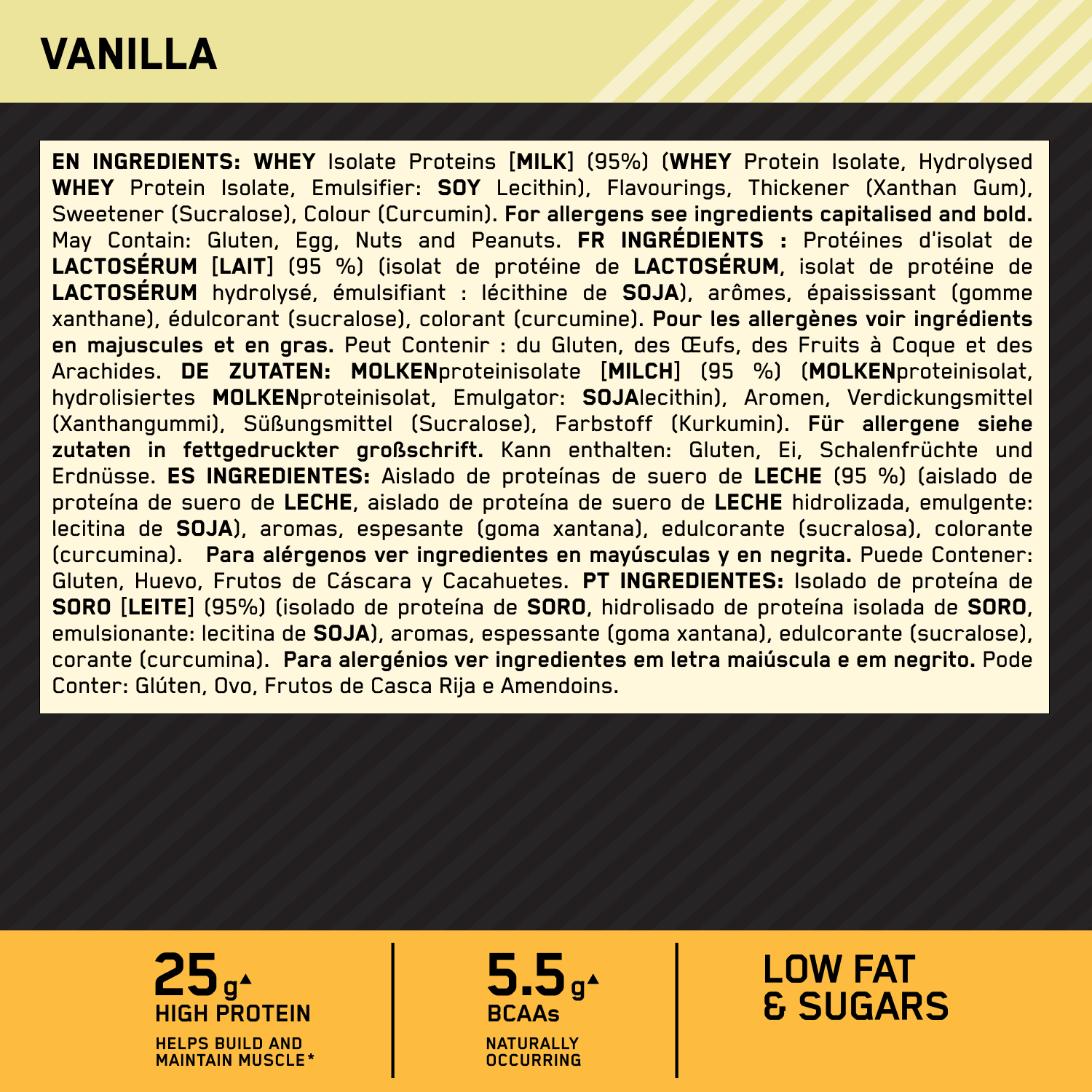 In creating Gold Standard 100% Isolate, we start by selecting only the highest quality whey proteins which undergo a series of sophisticated filtration processes to ‘isolate’ out excess fat and sugar. A portion of this Whey Protein Isolate is then hydrolysed – broken down into smaller chains of amino acids. The final product is a complete protein containing no more than 0.3 g of sugars, 0.4 g of fat and 83% of pure protein per serving. We put in the hard work to assure superior quality so you can focus on achieving your performance goals.