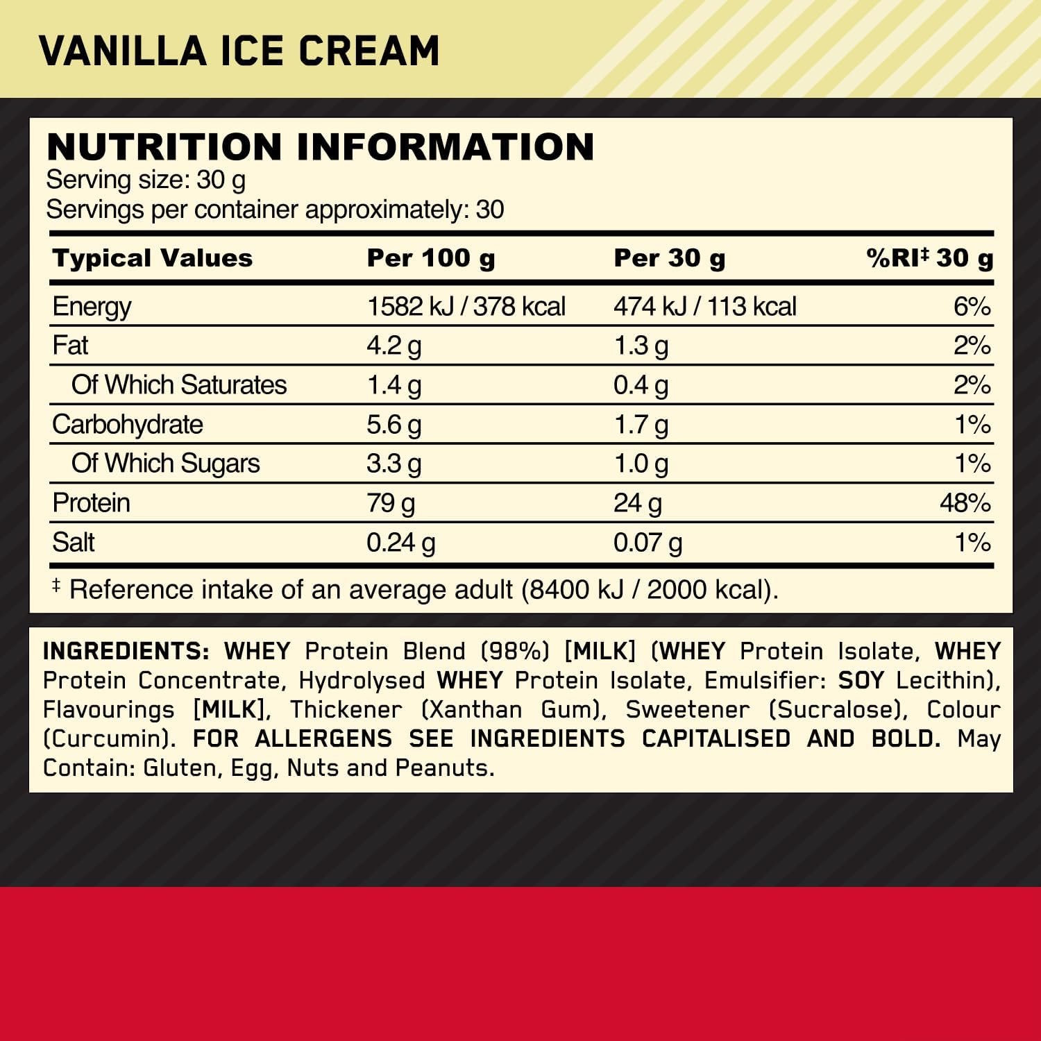 Each delicious serving of Gold Standard 100% Whey contains 24g of premium whey protein, 5.5g of BCAAs and 4g Glutamine/Glutamic Acid to aid muscle growth after your workout. And with just 1g of fat, 1g of sugar and 3g of carbs, it's the perfect choice!